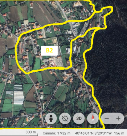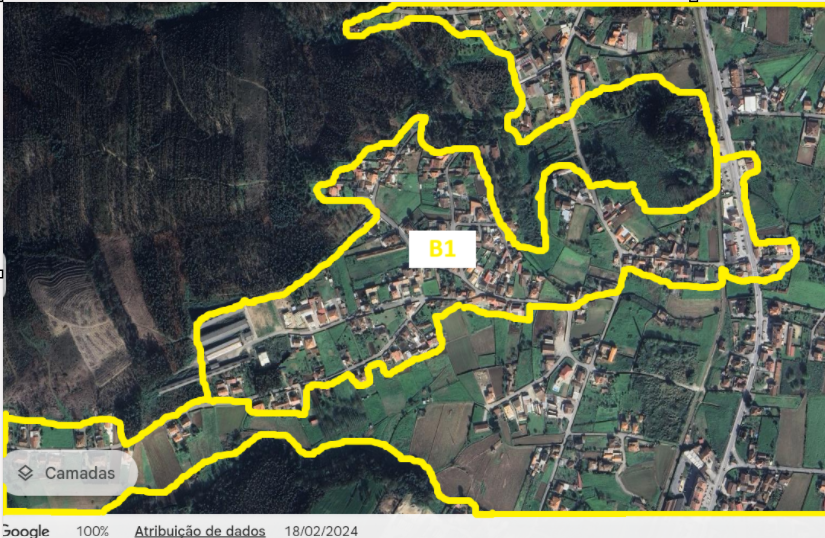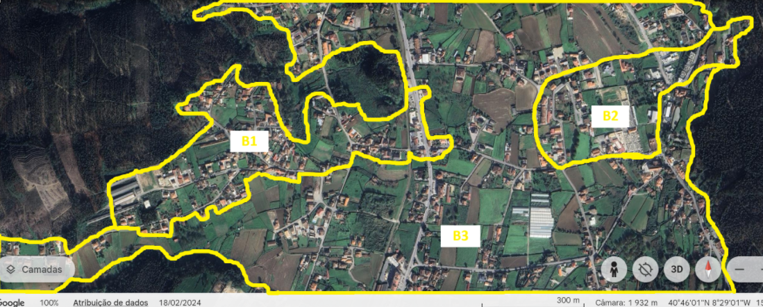 . Zona B3- Recorte que conta com edificado urbano e com edifícios de carácter religioso. Área compactada e não tem grandes presenças de zonas verdes, é possível ver um cemitério nesta paisagem bem como algum edificado de apoio urbano algumas moradias, por esse mesmo motivo não há um grande destaque para a agricultura